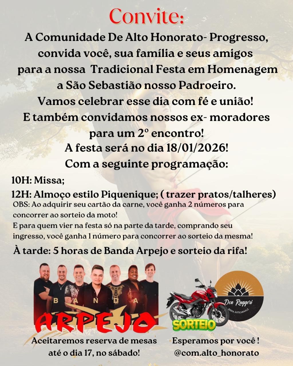 Um momento único para rever amigos e familiares que fizeram parte da história de Alto Honorato. Se você conhece alguém que morou na comunidade, não deixe de compartilhar este convite!