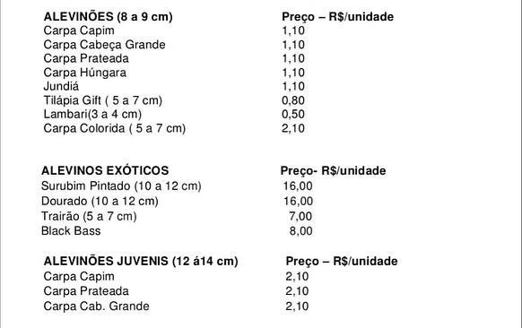 Os interessados poderão adquirir espécies como carpas, jundiás, tilápias, lambarís, surubins, dourados, traíras e black bass, com valores que variam conforme o tamanho e o tipo do peixe (tabela em anexo).